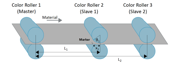 This topic covers positional corrections of geared color print rollers on a web style, offset printing machine. Figure 1 shows material being pulled through three printing rollers, each a different color. The second and third rollers are geared to the first with a 1:1 ratio. Each roller must be properly aligned so that as the material is pulled through, the printed colors line up. In a perfect world, this can be calculated knowing the distance in-between rollers and the radius of the rollers.