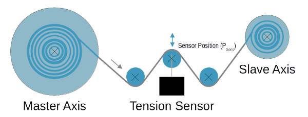 This first scenario deals with the problem of maintaining tension on a winding application. Figure 1 below shows a master reel feeding a slave reel with a tension sensor on the material. To maintain a specific tension, the slave axis must be geared to the master axis with a certain gear ratio. The main challenge comes when the feed-rate varies with the changing diameters of the master and slave axes as the material leaves the master and is wound on the slave. Therefore, what is required is a control loop using tension feedback to adjust the effective gear ratio.