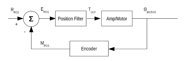 Tension control requires a control loop similar to the position loop used in servo control systems, shown below in Figure 2. The position loop takes a reference position (RPOS) and calculates the position error (EPOS) as the difference between the reference position and the actual motor position as measured by the encoder (MPOS). This position error is fed into the position loop filter, typically a PID filter, to produce a torque output (TOUT). This torque output is sent to the amplifier that applies torque to the motor to move the motor position (ΘMOTOR).