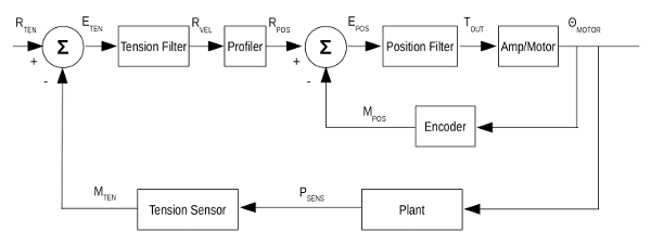 The tension control loop is implemented around the position loop. Figure 3 shows the control loop including tension control. The error in tension (ETEN) is calculated by the difference in the reference tension value (RTEN), which in this application is a static value, and the measured tension (MTEN). After filtering the error value, a jog speed is issued (RVEL) to drive the tension error to 0.