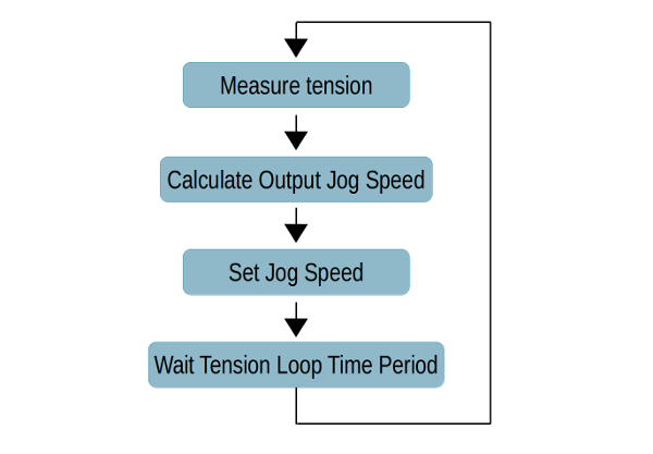 This application setup was implemented and tested using Galil's high-performance DMC-40x0 motion controller. As part of a Galil motion controller, the position loop and motion profiler is embedded in the controller's firmware, therefore, the motion code needs to have a simple loop that follows the flow chart shown below in Figure 4 to implement the tension control.