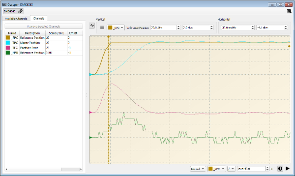 To test the response of this tension loop, a step profile was used for the reference tension. The reference tension (_RPC), measured tension (_TPC), tension error (_TEC), and slave axis velocity (d/dt _RPB) are all plotted below in Figure 5 using Galil's GDK software suite.