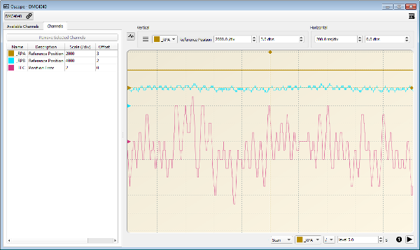 Figure 6 shows the response of the full system when the master spindle is at a constant speed. The speed of the master axis is 2048 counts/sec and is shown in yellow on the graph below. The slave axis (blue) has a gear ratio of 2, so the nominal speed would be 4096 counts/sec. The plot shows that the actual speed is slightly varying around that nominal speed of 4096. This is due to the tension control loop. The tension error (magenta) is consistently within 7 counts of the reference tension during the performance of the system.