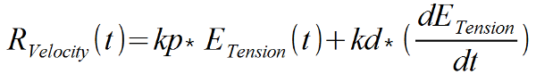 Since the tension loop is a lower-bandwidth loop over the position loop, the sample time period for the tension loop should be greater than that for the position loop. For this case, the period for the position loop is 1ms, while the period for the tension loop is 10ms. The filter implemented for the tension loop is a PD filter. Therefore, every loop the controller measures the tension error, the derivative of the position error, and sets the jog speed of the slave axis based on the following equation.