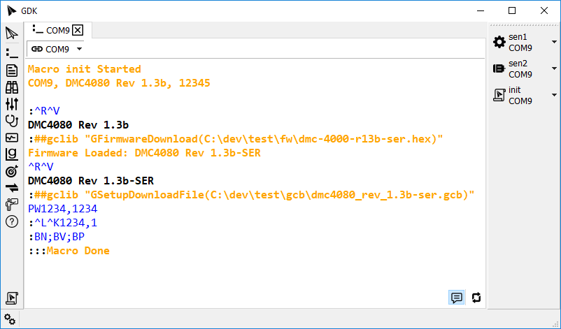 A macro is a simple text file containing DMC commands. It is very similar to an embedded dmc Galil program, but has the file extension sen (for send file). Any command that can be sent from the GDK Terminal can be used within a sen macro file. Commands that are only supported in an embedded program are not supported in macros (IF, JP, etc).