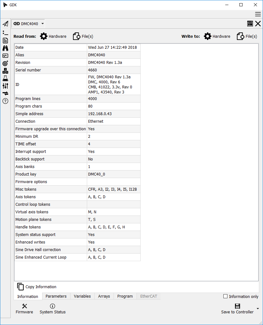 This will upload parameters, variables, arrays and the program into GDK's memory. - Next, connect to the destination controller and click the Write to: