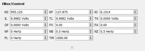 The top panel of the inputs contains all of the parameters on the motion controller that can be adjusted for tuning the feedback loop. They are displayed as two-letter DMC commands that apply to the selected axis. Each command can be hovered over to bring up a tooltip with the command's full name, and they are described in the motion controller's command reference.