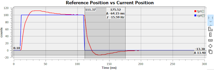 - Step Response: This evaluation is used to push the feedback loop to saturation and characterize the axis as underdamped, overdamped, or stable. It does this by commanding a sudden jolt to a new position, dwelling there for a short period, then commanding another jolt to the original position. The “Amplitude” should be large enough to engage motion in all of the mechanical components of the axis, and the “Dwell time” should be a reasonable amount of time for the axis to settle at a new position. The “Error Limit” determines the maximum amount of error that the axis can sustain to be considered settled. Three plots are shown after evaluation: one comparing the reference (commanded) position against the actual position, one showing the position error, and one showing the torque.