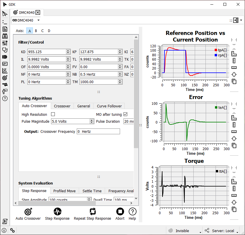 Tuning can often be greatly simplified by using one of Galil's Tuning algorithms found in the center input panel.